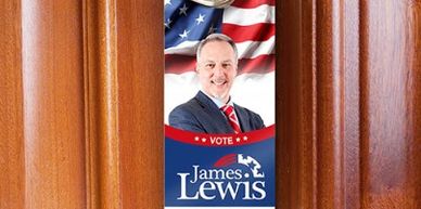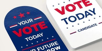 Political door hanger allows a campaign to engage voters directly through face to face communication. Campaign door hangers are available in multiple sizes starting with the smallest, 8.5" x 3.5" and 11" x 4", the most popular dimensions for this application. A half-fold option is available to offer more space for in-depth information without increasing the overall size. You can also add a perforation to your door hangers for tear off information such as telling voters when and where to vote.